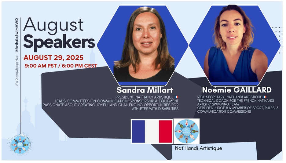 En tant qu’entraîneur technique de Nat’Handi Artistique, j’ai eu l’immense honneur d’être conviée comme intervenante à un webinaire international organisé par l’AWD Knowledge Hub.C’est une belle reconnaissance, qui me permet de représenter la France dans le domaine de la natation artistique pour personnes en situation de handicap. Aux côtés de Sandra Millart, présidente de Nat’Handi…